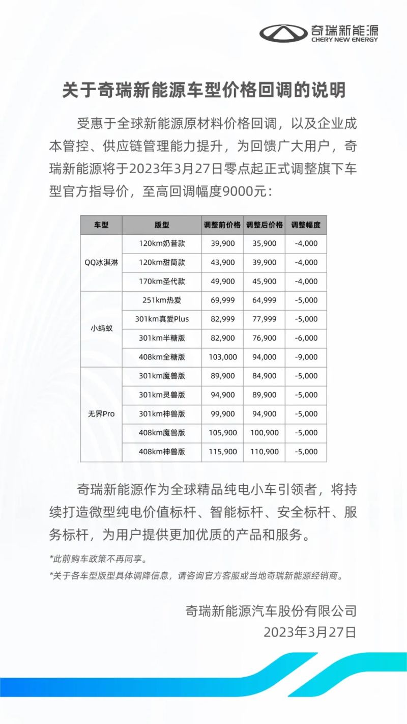 · 奇瑞新能源·价格·调整·