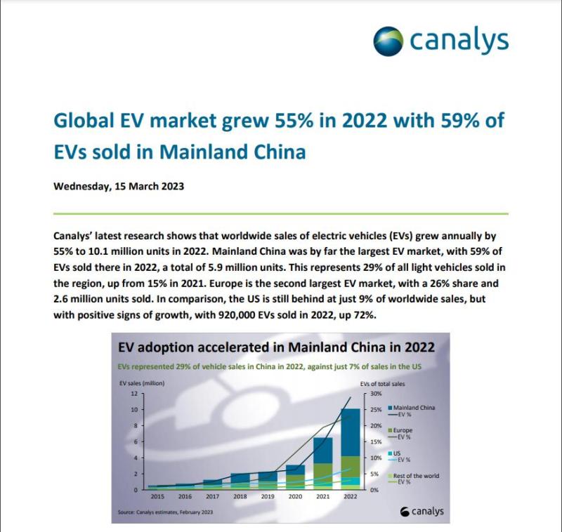 Canalys统计的2022年度全球新能源汽车销售数据已发布,全球新能源汽车年增长量为55%,共计1010万辆,2022年59%的新能源汽车销量来自中国。 ...